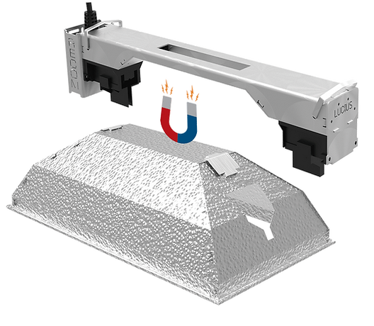 All LUCIUS Reflectors use the new MAG-ATTACH system; fixing and releasing reflectors with ease. Using a magnetic field with built-in thermal insulators to reduce the heat transfer into the ballast and increasing life span of equipment. This prevents the fixture acting like a heat sink and decreasing the bulbs burning temperature. This allows the ceramic arc tube to burn brighter, producing greater light output and efficiency.