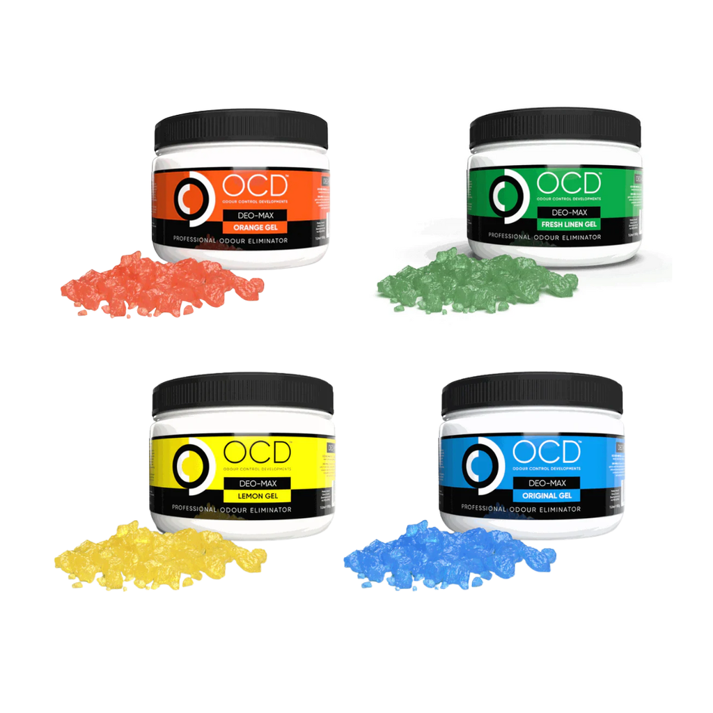 Our OCD Lemon gel and our other gel fragrances come in 1 Litre, 4 Litres and 22 Litre tubs. So if you have a smelly washing basket, take a 1-litre tub. If Grandad ate too many beans, that would require a 4 Litre tub and if you have multiple teenagers, break out the 22 L OCD gel. The OCD lemon scent makes it smell great, and the OCD DEO MAX gets rid of the bad smells completely.